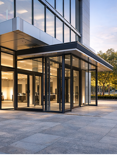 Pfosten-Riegel-Fassaden ermöglichen maximale Transparenz bei gleichzeitig hoher technischer Sicherheit. Die klare Linienführung schafft eine zeitlose, strukturierte Gebäudehülle – ideal für Bürogebäude, Verwaltungsbauten und repräsentative Großprojekte.